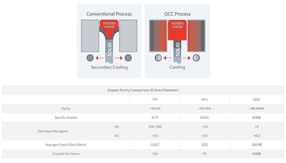 Processen är mer kostsam vid tillverkningen då man extremt långsamt drar fram metallen för så långa kristaller som möjligt. Inom audiobruk är OFC-kopparn den mest förekommande, där kristallerna är ungefär 2 cm långa. Övergångarna mellan dem agerar som ickelinjära "motstånd" till strömmen. I ledarna dragna med OCC-processen är de över 6.000 gånger så långa, närmare 125 meter! Det innebär att man inte får samma interna, granulerade struktur mellan otaliga kristallövergångar som annan koppar, utan en enda ren kristall i hela kabeln. Det ger mindre distortion och ett renare ljud, och är inget som går att uppnå med vare sig polerade Litz-ledare eller silverplätering!
