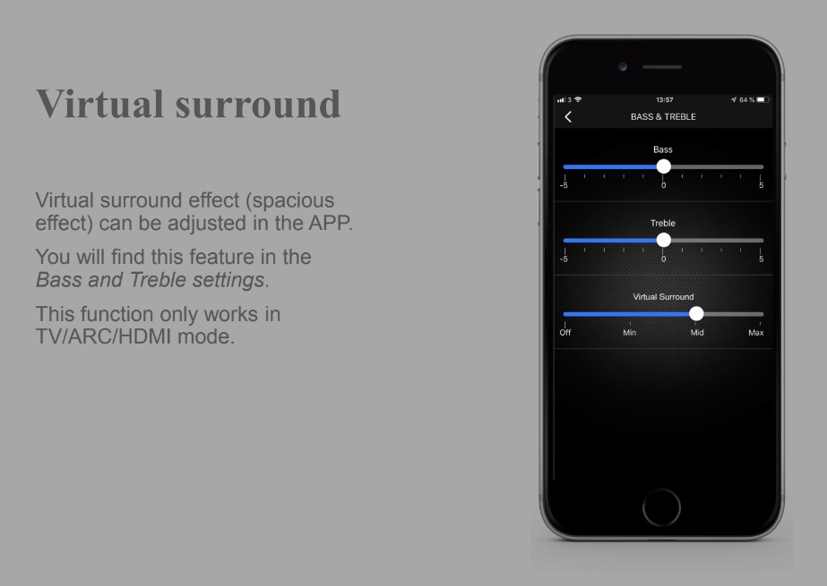 Föregångarna hade dubbla optiska ingångar. På nya A26 och A36 har den ena optiska ingången tagits bort och ersatts med en HDMI med ARC. En HDMI-kabel blir därmed den perfeka bryggan mellan platt-TV:n och högtalarna. Har man inbyggda appar i smart-TV:n, som Netflix, YouTube, SVT Play m.m., så kommer ljudströmmen att skickas ut från TV:n och ner till högtalarna. En funktion som tillkommer är att man via HDMI ARC kan reglera högtalarnas volym via TV:ns fjärrkontroll. Dessutom finns det en Virtual Surround-funktion som är exklusiv för HDMI ARC. Denna justeras via appen och ger en utökad virtuell surroundupplevelse när man tittar på film.