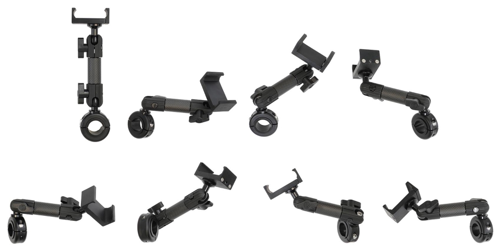 Vakaa moottoripyöräteline puhelintelineellä asennettavaksi ohjaustankoon. Kiinnike on nivelöity kahdessa kohdassa, joten voit helposti säätää kulmaa ja lukita haluttuun asentoon siipimutterilla. Jalustaosa on 123 mm pitkä ja se voidaan kiertää 360°. Kokonaispituus 156 mm. Sopii moottoripyörän ohjaustankoihin, joiden halkaisija on 20–32 mm. Voidaan käyttää myös polkupyörissä, sähköpyörissä ja muissa pyöreissä putkissa, joiden halkaisija on 20–32 mm.