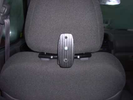 1. Poista pääntuki. Aseta pääntukiteline pääntuen tankoihin. Asennuslevyn tulee olla pääntuen takapuolella. Laita pääntuki takaisin paikalleen.