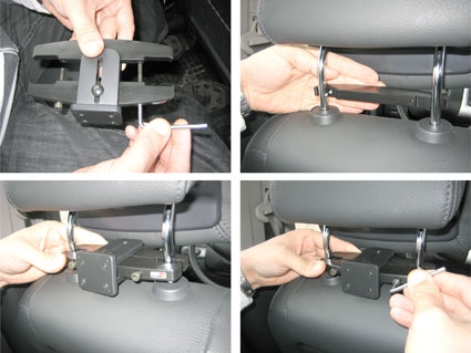 Kiinnike asetetaan etuistuimen niskatukeen. Voit asentaa sen itse muutamassa minuutissa, mukana tulee asennusohje. Kiinnikkeen asennuslevyssä on esiporatut reiät, jotka helpottavat pidikkeen asentamista.