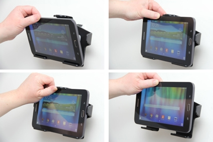 Pidike on varustettu pallonivelellä, jonka avulla sitä voi kallistaa ja kiertää välttääksesi heijastuksia näytössä. Vaihdat helposti pystyasennon ja vaakasuuntaisen asennon kääntämällä pidikettä haluttuun asentoon. Galaxy Tab 3 Lite -laitteen asettaminen pidikkeeseen on helppoa, ja voit ottaa sen mukaasi, kun poistut autosta.