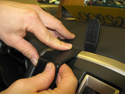 1. Paina mukana toimitettu kapeudenavaaja ilmanvaihtoventtiilin ja stereon kehystä vasten levittääksesi rakoa. Poista suojamuovi ProClip-kiinnikkeen kaksipuolisista teippinauhoista. Paina kiinnikkeen alaosa rakoa vasten kapeudenavaajan vieressä. Poista kapeudenavaaja.