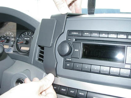3. Paina teline alaspäin ja sitten eteenpäin telineen alaosaa niin, että vinokulmainen reuna kiinnittyy rakoon stereon ja ohjauspaneelin kehysten välissä.