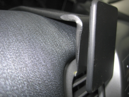 2. Paina kiinnikkeen alaosa ilmanvaihtoaukkoa vasten niin, että viistokulmainen yläosa lukittuu rakoihin.