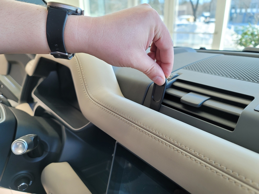 2. Kiinnitä kiinnikkeen kulmikas alaosa raon väliin mittariston ja listan välissä.