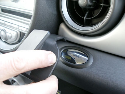 2. Paina kiinnikettä alaspäin/eteenpäin niin, että yläreunan taitettu reuna lukittuu ilmastointiaukon ympärillä olevan paneelin taakse. Kiinnitä kiinnikkeen kallistettu alaosa kojelaudan reunan alle.