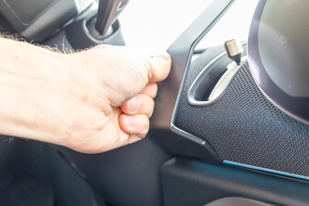 2. Kohdista kiinnike ilmanvaihtoritilän vasemman kehyksen kohdalle. Paina mukana toimitetut raonavaajat mittariston yläpaneelin alle kiinnikkeen molemmilla puolilla raon laajentamiseksi.