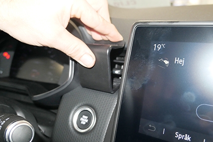 2. Paina kiinnikkeen yläosa tiukasti alas, jotta kiinnike taivutuu. Paina kiinnikkeen yläosa eteenpäin ja vapauta varovasti paine, jotta kulmikas yläosa menee ilmanvaihtoventtiilin kehystä ja kojelautaa ympäröivään rakoon.