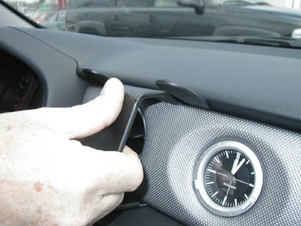 3. Paina jousiavain ilmanvaihtoaukon kehyksen ja ohjauspaneelin väliin, yksi kummallekin puolelle pidikettä. Paina pidikkeen alaosaa eteenpäin niin, että uritettu alaosa menee rakojen väliin jousiavaimien väliin. Paina kunnes kuulet/tunnet sen napsahtavan paikalleen. Poista jousiavain.
