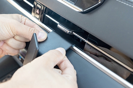 1. Käytä mukana tullutta kosteuspyyhettä puhdistaaksesi alueen, johon ProClip-kiinnike asennetaan. Poista kaksipuolisen teipin suojamuovi. Paina kiinnikkeen alaosa ilmastointilaitteen ohjauspaneelin ja kojelaudan väliin.
