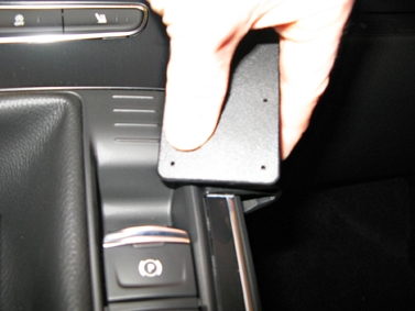 2. Paina kiinnikkeen oikeaa osaa alaspäin niin, että kalteva reuna lukittuu keskikonsolin alle.