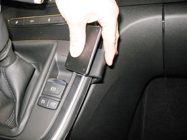 3. Paina kiinnikkeen oikeaa osaa alaspäin niin, että kalteva reuna lukittuu kunnolla keskikonsolin alle.