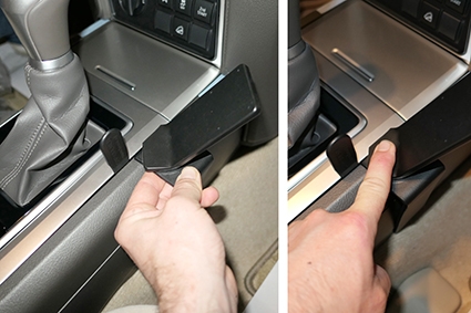 2. Paina kiinnikkeen kulmikas alaosa keskikonsolin sivuseinän rakoon.
