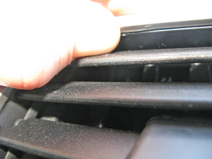 2. Paina kiinnikkeen vinokulmainen yläosa ilmastointiaukon yläreunan rakoon. Paina kiinnikkeen yläosa ylöspäin niin, että vinokulmainen reuna menee kokonaan rakoon ja teippi tarttuu.