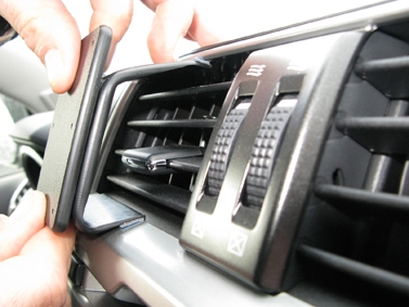 3. Paina kiinnikkeen alaosa ylöspäin/eteenpäin ja koukista vinokulmainen reuna ilmastointiaukon kehykseen.