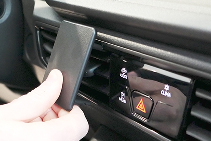 1. Käytä mukana tullutta kosteuspyyhettä puhdistaaksesi alueen, johon ProClip-kiinnike asennetaan. Poista suojamuovi kiinnikkeen kaksipuolisesta teipistä. Kiinnitä kiinnikkeen uritettu yläosa ilmanvaihtoventtiilin kehykseen.