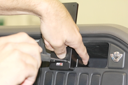 1. Poista kumimatto säilytystilasta. Käytä mukana tullutta kosteuspyyhettä puhdistaaksesi alueen, johon ProClip-kiinnike asennetaan. Aseta osan 1 ulkonevat osat säilytystilan vasemman puolen kolmeen reikään. Paina alaspäin, jotta ulkonevat osat menevät kokonaan reikiin.