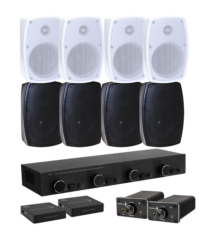 Till högtalarna får du inte bara en, utan två stycken Dayton Audio WFA02 WiFi-adaptrar samt två stycken DTA-120 förstärkare! För att du ska kunna styra ljudet i lalla 4 zoner medföljer naturligtvis även hen högtalarväxel, och i detta paket får du Växeln VSS4 från System One.