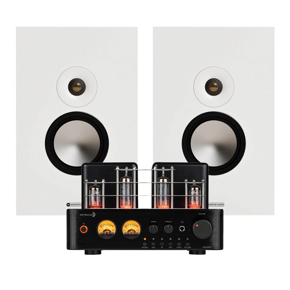 Dayton Audio HTA100 yhdessä Monitor Audio Bronze On-Wall 7G:n kanssa valkoisena tarjoaa sinulle tyylikkään ja tasapainoisen stereopaketin olohuoneeseen. Tyylikkäällä muotoilulla ja molempien merkkien vankalla tekniikalla saat äänielämyksen, joka tuntuu sekä elävältä että yksityiskohtaiselta, täydellinen musiikin ystävälle, joka haluaa laatua ja helpon asennuksen ilman kompromisseja.