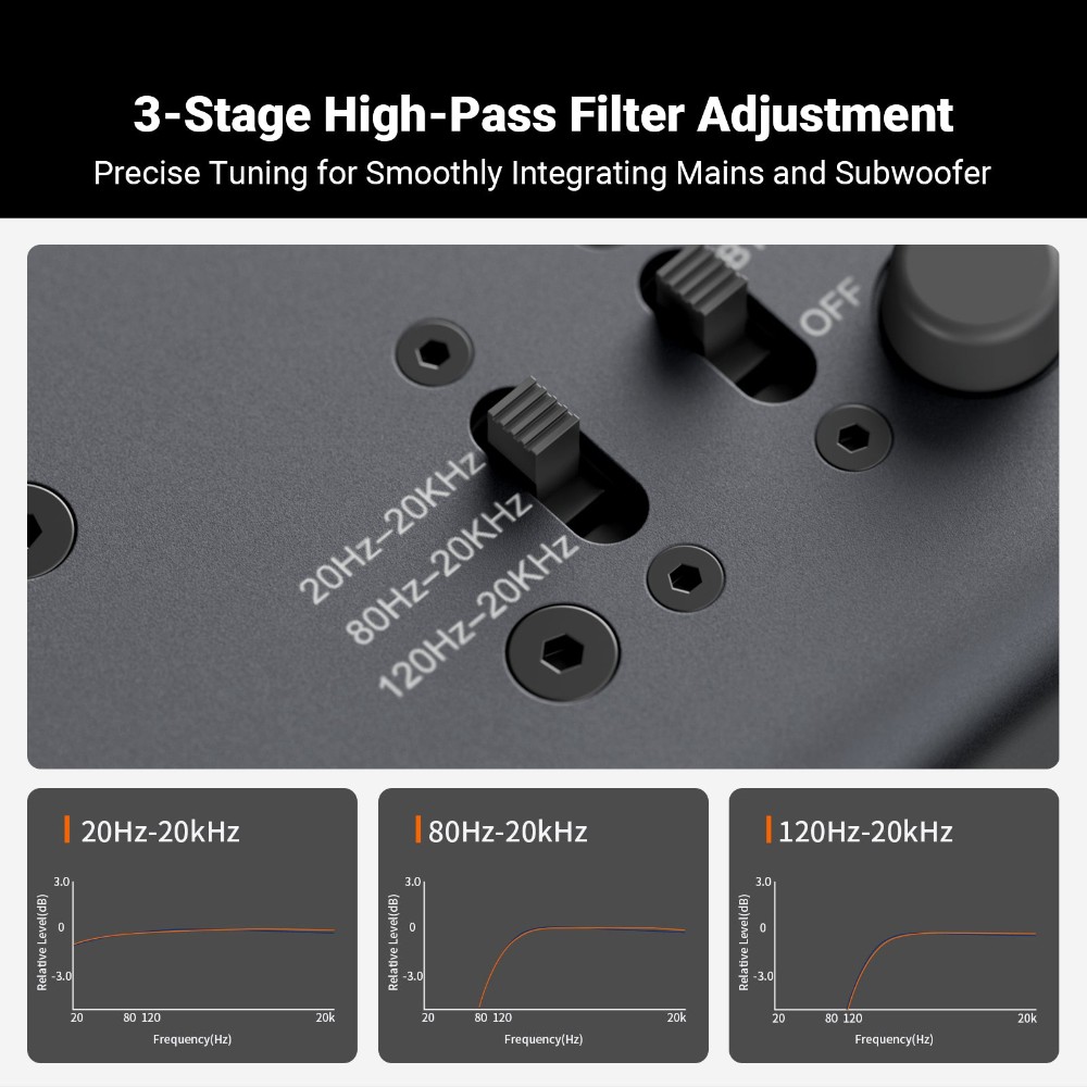 Yksi harkituimmista toiminnoista on säädettävä alipäästösuodatin kolmessa vaiheessa, 80 Hz tai 120 Hz, vaihtoehtoisesti täysi rekisteri 20 Hz. Kun suodatin aktivoidaan, keskiäänet ja diskantit lähetetään eteenpäin pääkaiuttimille RCA:n tai XLR:n kautta, kun taas matalat taajuudet johdetaan SUB-ulostuloon. Tuloksena on puhtaampi ja hallitumpi toisto, erityisesti järjestelmissä, joissa aktiivinen subwoofer huolehtii syvimmästä rekisteristä.