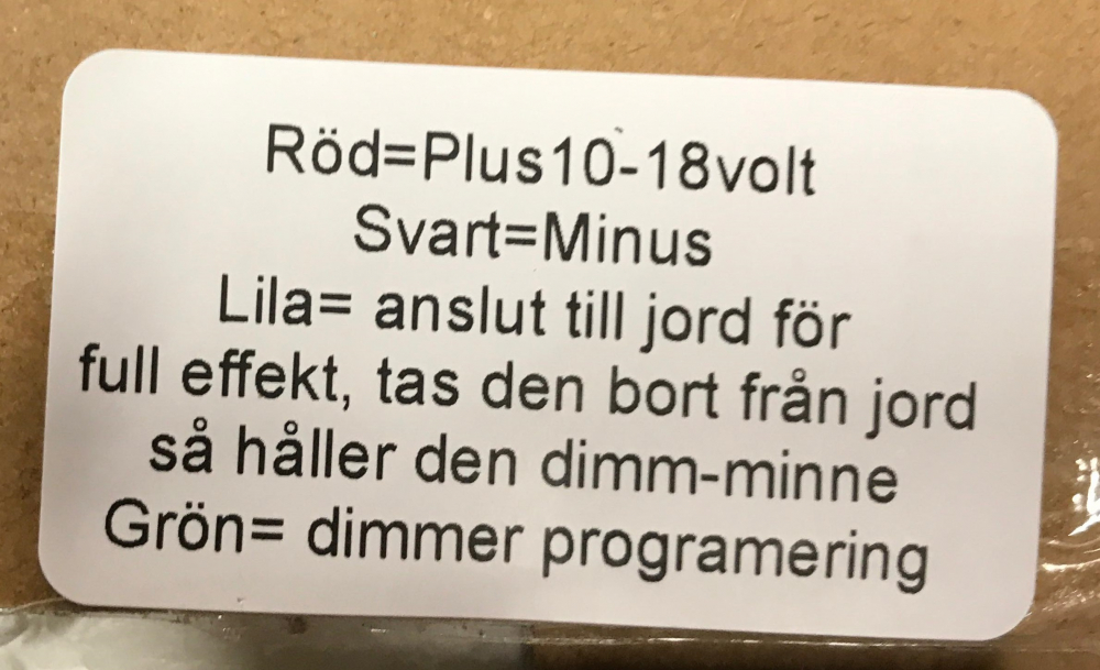Minnet för halvljuset/dimmernivån ställs genom att man temporärt håller den gröna kabeln mot jord, när man tar bort den gröna från jord så håller den kvar det valda effektläget i minne, från 1-35watt. Kabel med 4-trådar (svart/röd/grön/lila).