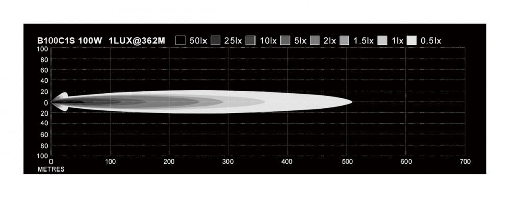 LED-rampen har en livslängd på minst 50000h vilket innebär att detta är inget du slänger iväg inom det närmsta årtiondet! Ljusbilden på B100C1S är av typen kombo, vilket innebär att denna ramp inte bara lyser långt utan även brett!