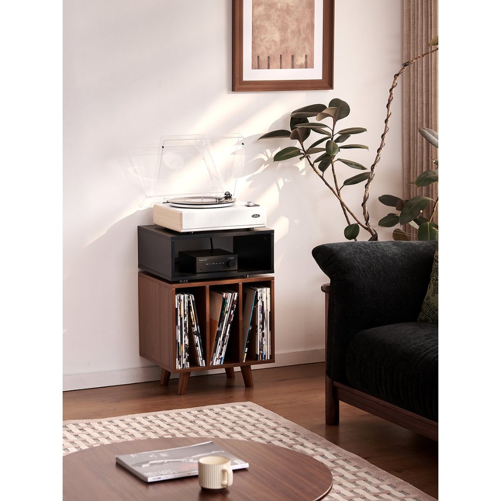 Elektroniikkaosio tarjoaa tilavan tilan esimerkiksi esivahvistimelle, verkkosoittimelle tai muulle hifi-laitteelle, 400 mm syvyydellä sisäpuolella. Vinyylitila on mitoitettu mahtumaan merkittävä määrä levyjä ja pitää ne helposti saatavilla.