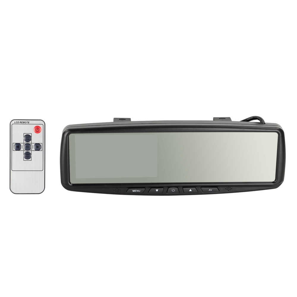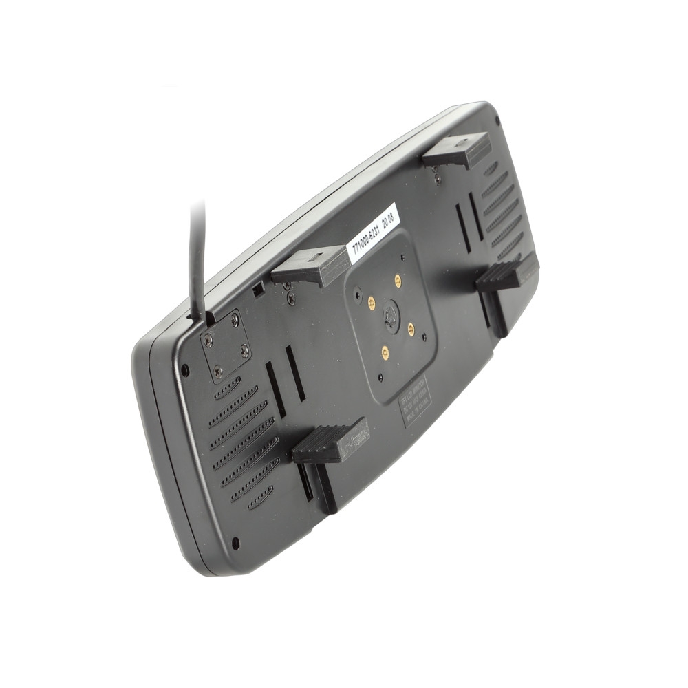 Monitorissa on universaali pidike, joka mahdollistaa sen kiinnittämisen OEM-peiliin autossa. Liitäntä tapahtuu helposti punaisen kaapelin avulla, joka liitetään kuormitukseen +12V:sta +24V:iin, musta kaapeli maata varten ja vihreä kaapeli videosignaalin laukaisemiseen.