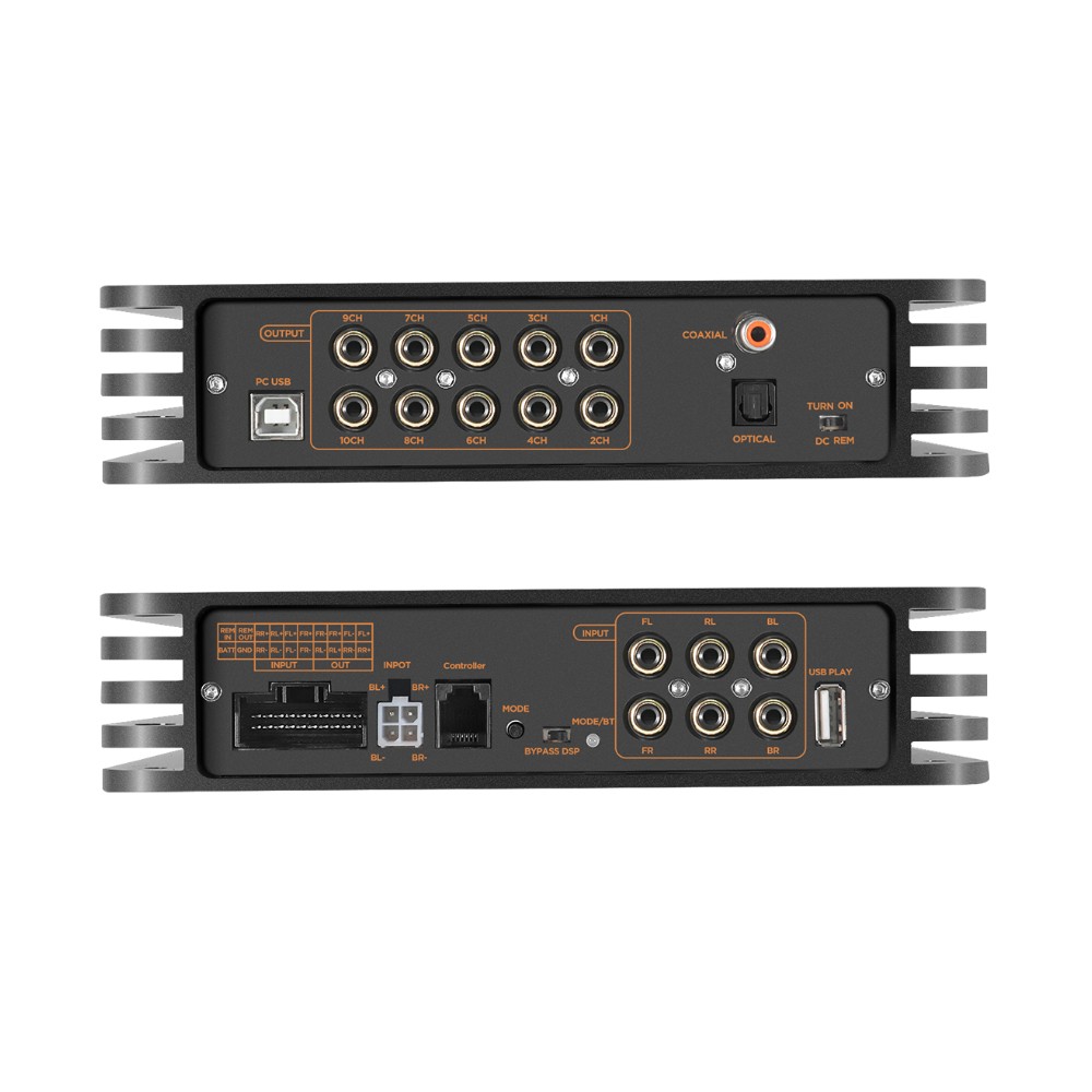 Sisäänrakennettu vahvistinosa tuottaa 4x25W RMS 4 Ohmilla ja 4x40W RMS 2 Ohmilla. Se riittää hyvin esimerkiksi diskantin ja keskiäänen aktiiviseen käyttöön tai älykkääksi tehopohjaksi asennuksessa, jossa rakennat edelleen ulkoisilla vahvistimilla 10 RCA-lähdön kautta.
