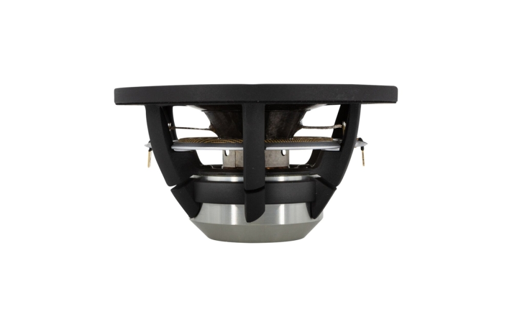 Valualumiinikotelo on aerodynaamisesti muotoiltu ja tuulettuva vähentämään puristusongelmia ja jäähdyttämään puhekelaa tehokkaasti suurilla kuormilla. Käänteinen ripustus pehmeällä luonnonkumilla tarjoaa pienen mekaanisen vaimennuksen ja vakaan liikkeen, mikä vähentää säröä ja parantaa kalvon liikkeiden hallintaa. Yhdessä nämä tarjoavat tukevan ja luotettavan rakenteen, joka kestää dynaamiset musiikkiosuudet menettämättä tarkkuutta.