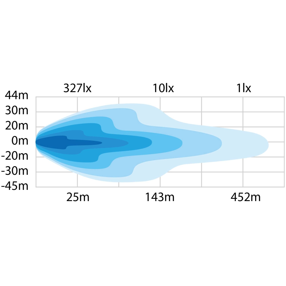 - Laajennettu kantama ja laajempi valokeila: Näe pidemmälle ja saat dramaattisesti laajemman näkökentän – yli neljä kertaa laajemman kuin auton tavallinen kaukovalo – mikä auttaa ennakoimaan mahdollisia vaaroja ja reagoimaan tehokkaammin. Tämä ratkaisu tuottaa todellisen valovirran 9500 lumenia ja valaisee 452 metriä (1 LUX), tarjoten poikkeuksellista näkyvyyttä.