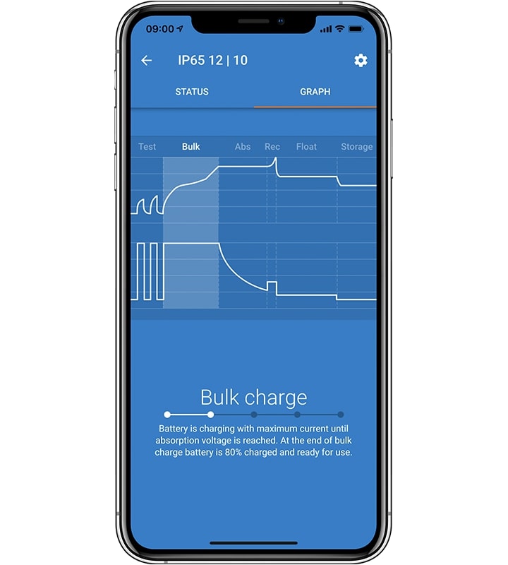 Installera, läs av och konfigurera din laddare Blue Smart IP65 via din smarttelefon! Med den smarta appen kan du se status laddare och batteri, samt till och med kontrollera funktionen på din laddare genom att använda appen VictronConnect. Som standard kan du läsa av spänning och ström på skärmen!